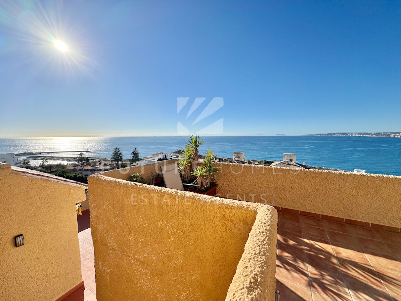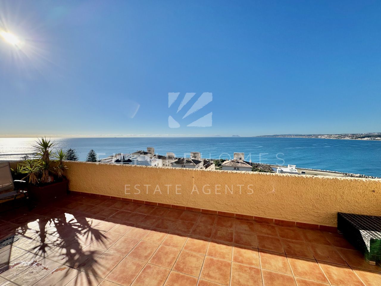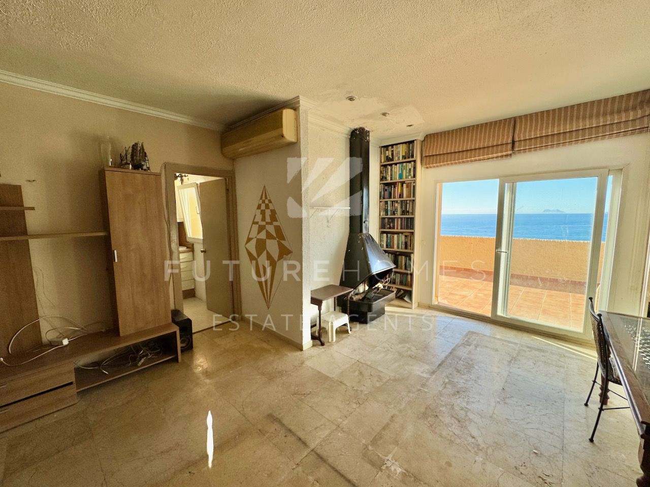 UNIQUE OPPORTUNITY to purchase this spectacular property in prime location next to Estepona marina and Playa del Cristo, with unbeatable panoramic sea views!! Duplex penthouse with three private terraces and an ideal south-west orientation. The views are just stunning and the property has potential to be one of a kind in the area. The entrance level is comprised of a large living room (over 30m2!) with high ceilings and a wood burner, a kitchen which could easily be opened up to make an open plan living space and direct access to a private terrace with amazing open views. From this terrace there is a spiral staircase with access to another private rooftop solarium (once again the views are incredible!). On the first floor of the property there are four bedrooms and two bathrooms, as well as a third terrace / balcony with sea and mountain views. The potential is outstanding and it would make for a wonderful home in an ideal location. Well established community with a shared swimming pool and communal parking on site. Sure to sell very quickly!!