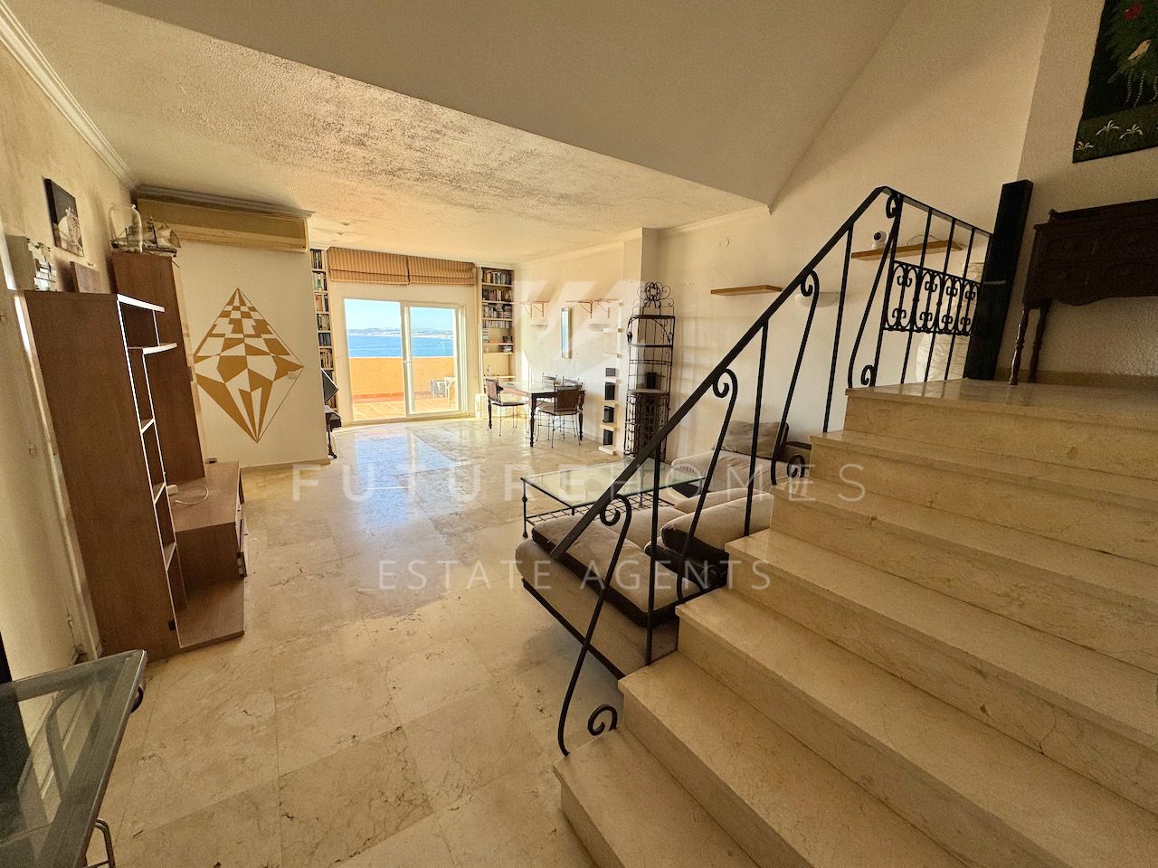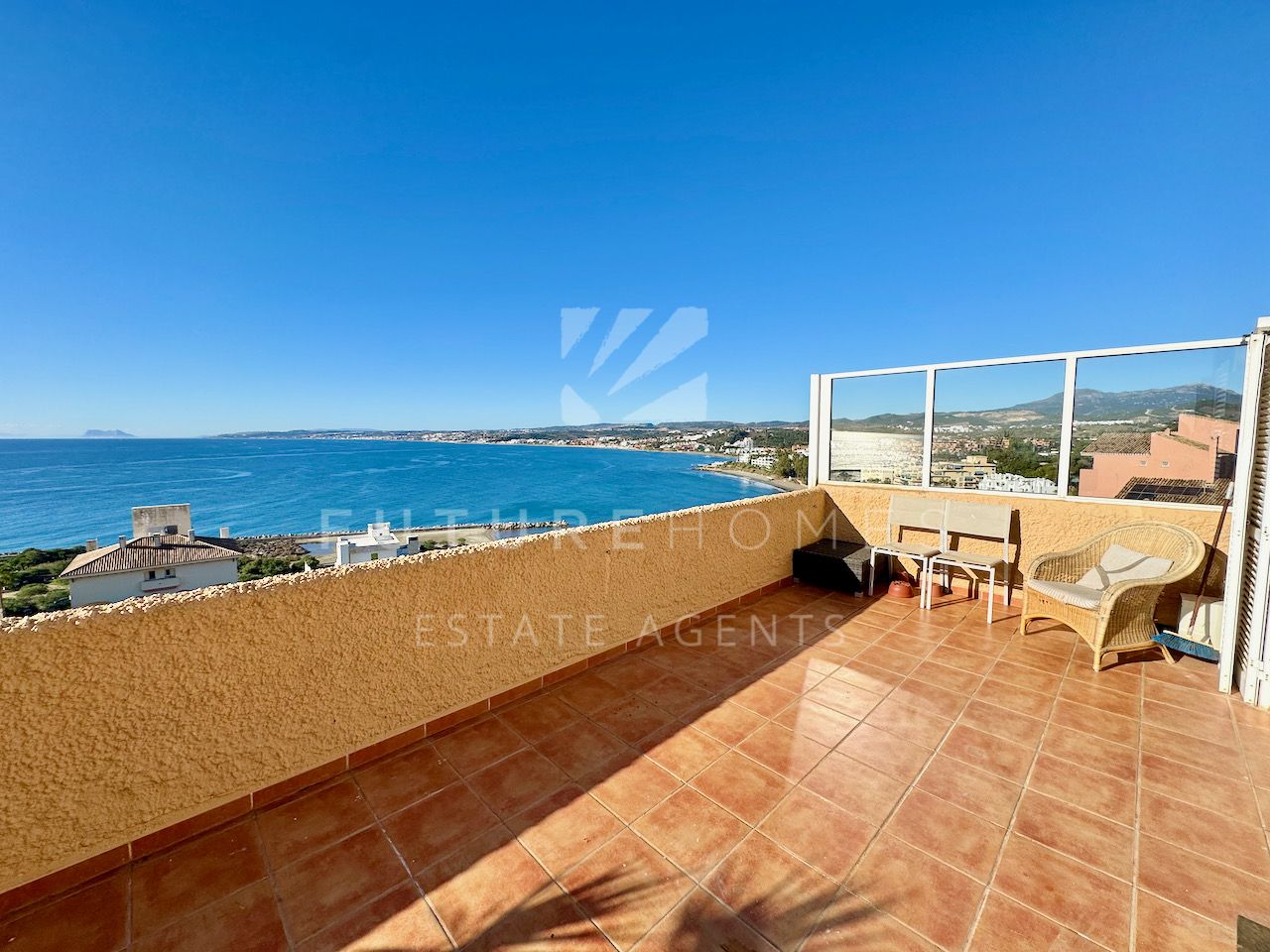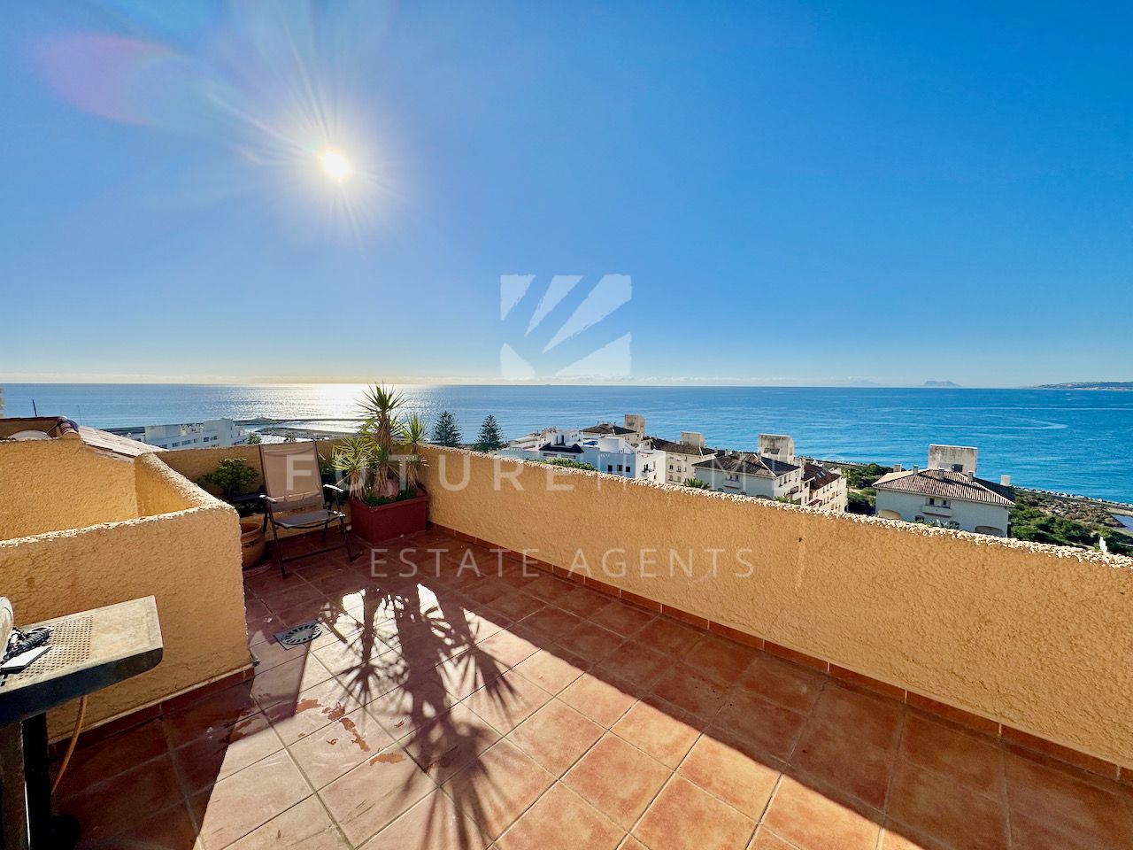 UNIQUE OPPORTUNITY to purchase this spectacular property in prime location next to Estepona marina and Playa del Cristo, with unbeatable panoramic sea views!! Duplex penthouse with three private terraces and an ideal south-west orientation. The views are just stunning and the property has potential to be one of a kind in the area. The entrance level is comprised of a large living room (over 30m2!) with high ceilings and a wood burner, a kitchen which could easily be opened up to make an open plan living space and direct access to a private terrace with amazing open views. From this terrace there is a spiral staircase with access to another private rooftop solarium (once again the views are incredible!). On the first floor of the property there are four bedrooms and two bathrooms, as well as a third terrace / balcony with sea and mountain views. The potential is outstanding and it would make for a wonderful home in an ideal location. Well established community with a shared swimming pool and communal parking on site. Sure to sell very quickly!!