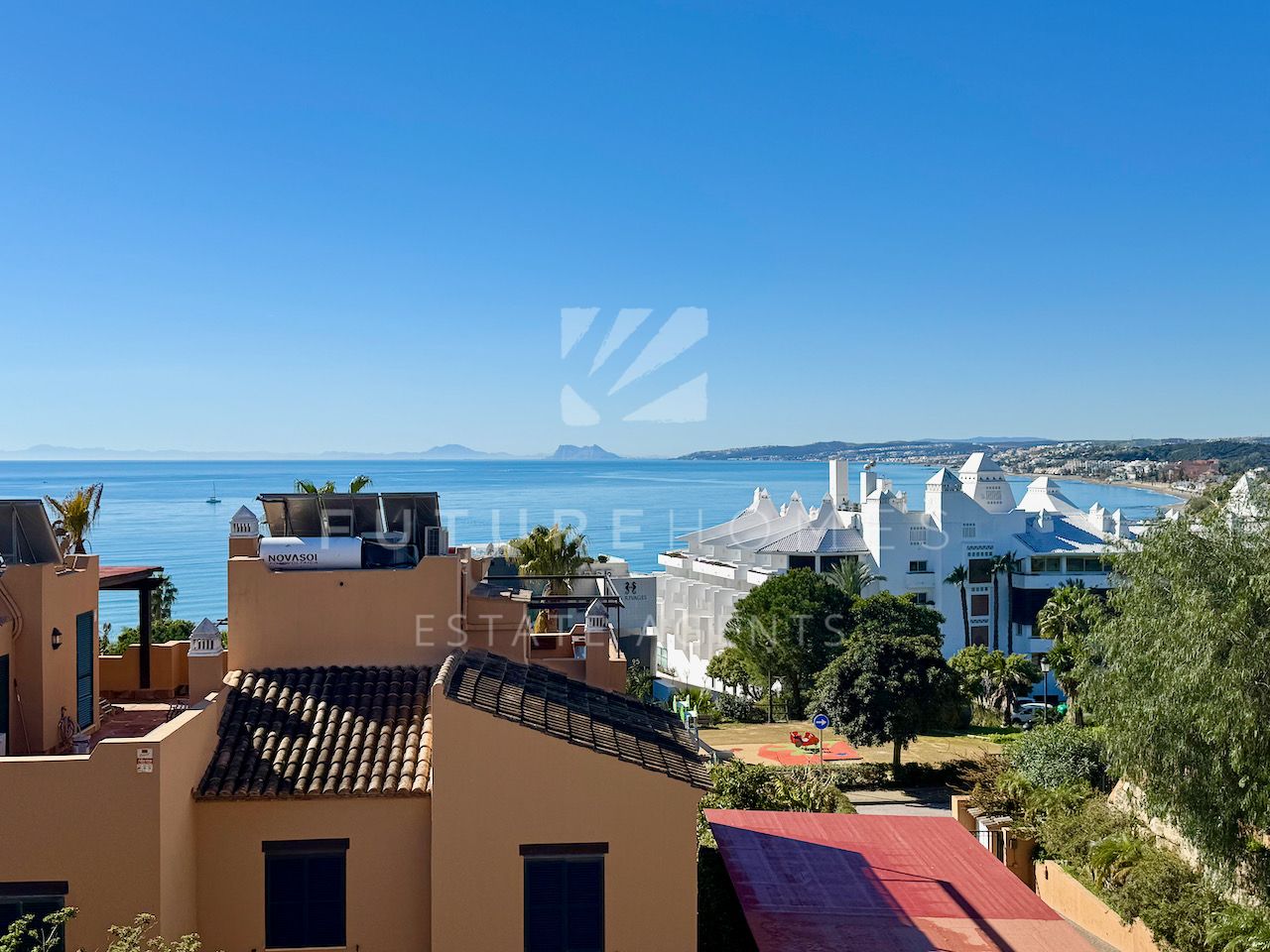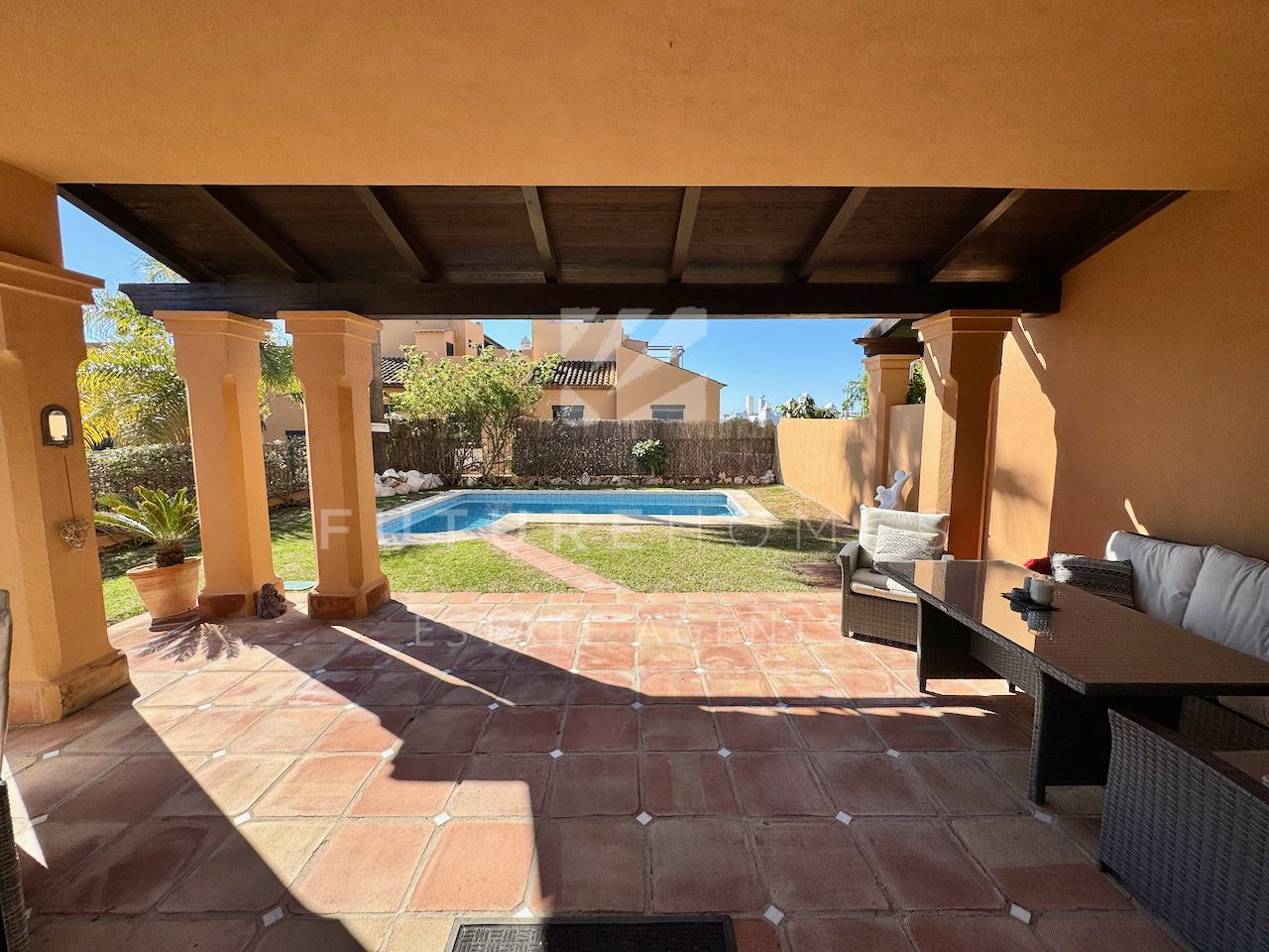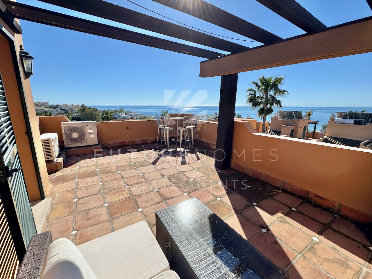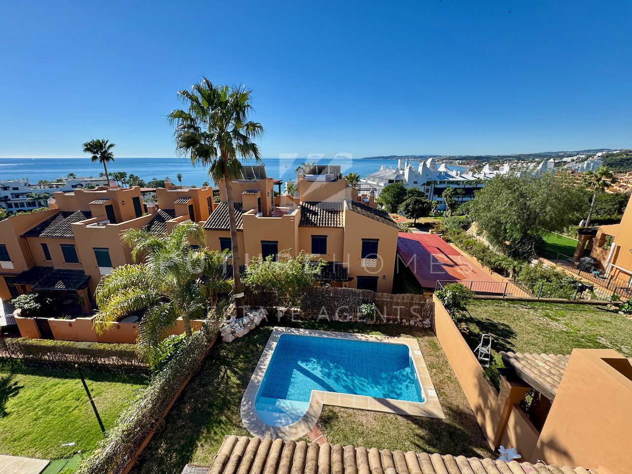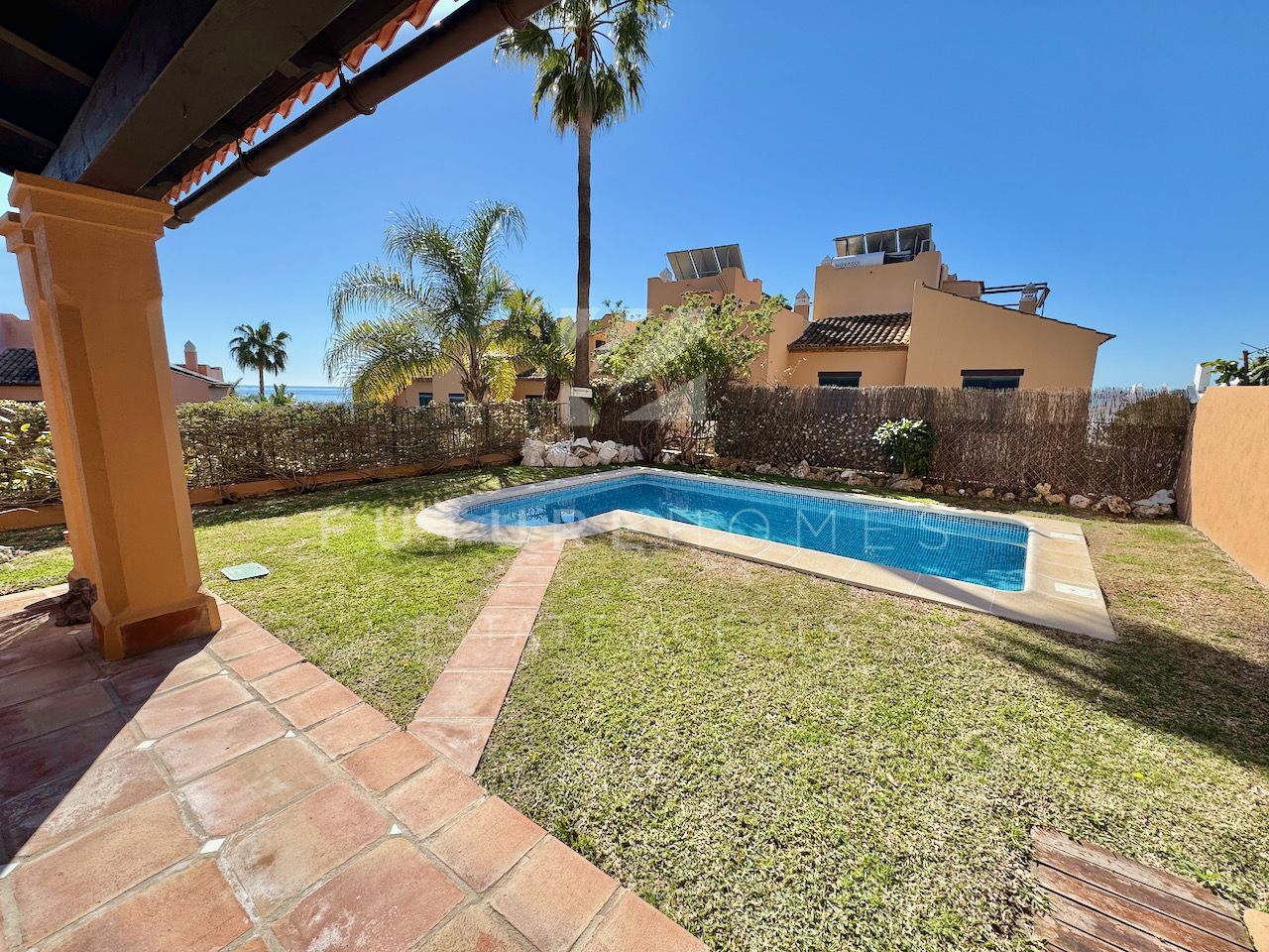 Superb semi detached townhouse for sale in one of the most demanded communities within Seghers, next to El Cristo beach and just less than a 10 minute walk from Estepona marina. Small residential urbanisation which is 100% occupied and lived in year round as permanent homes, these houses are in such demand that people knock on doors hoping owners will sell! This property is within the first phase of the community, one of just 8 semi detached houses and the only one with its very own private salt water swimming pool! As you enter, there is a very spacious reception area that leads onto a fully fitted modern kitchen with Siemens appliances and a lovely dining area within the kitchen itself, very practical indeed. On the same level there is a guest WC, storage cupboard and of course the large living / dining room with fireplace and large french doors opening onto the covered south facing terrace / garden area, ideal to enjoy the sunshine and a dip in the pool! On the first floor there are three double bedrooms, the master has a walk-in wardrobe and a very large bathroom with bath and separate shower, the balcony off the master bedroom has lovely open views. The two additional bedrooms share a family bathroom. The top level of the property has an amazing roof top terrace with incredible panoramic sea views and all day sun, an amazing space that is often converted into a fourth bedroom / home office. Private double carport with pergola roof. Two communal swimming pools. A fantastic property in an absolute prime location. Sure to sell quickly!!