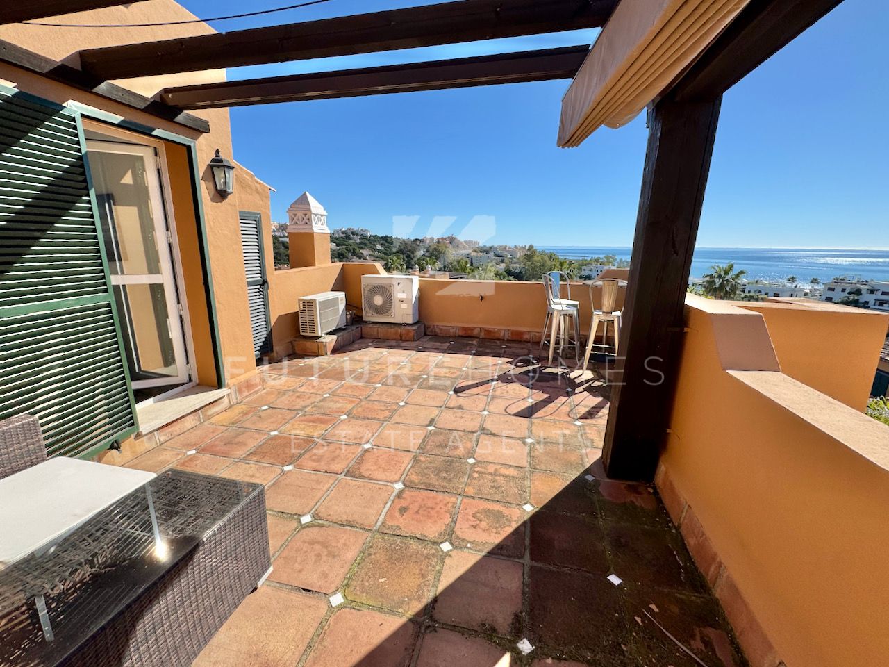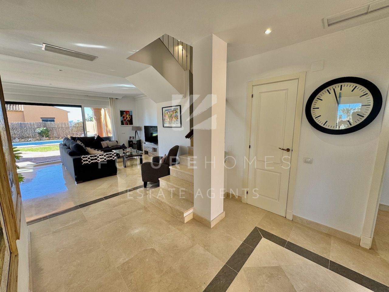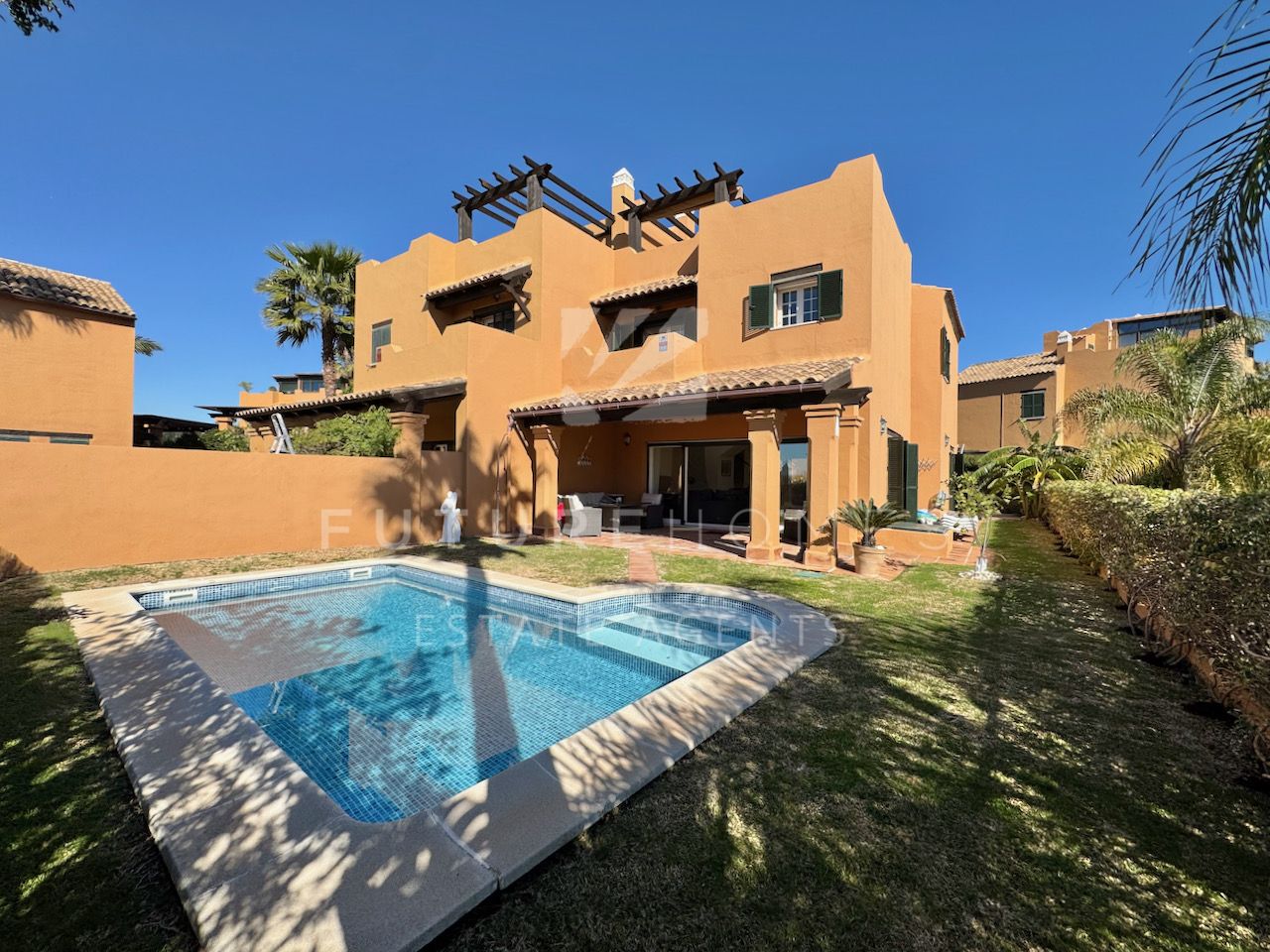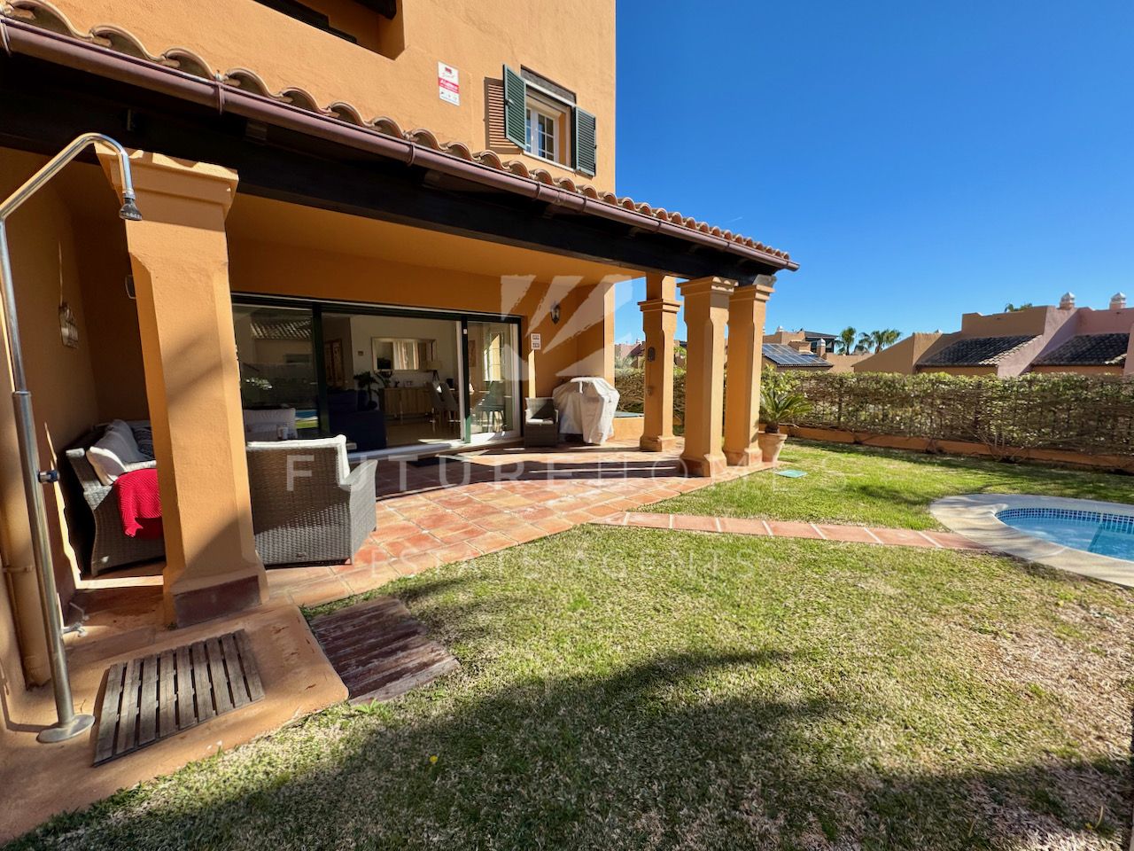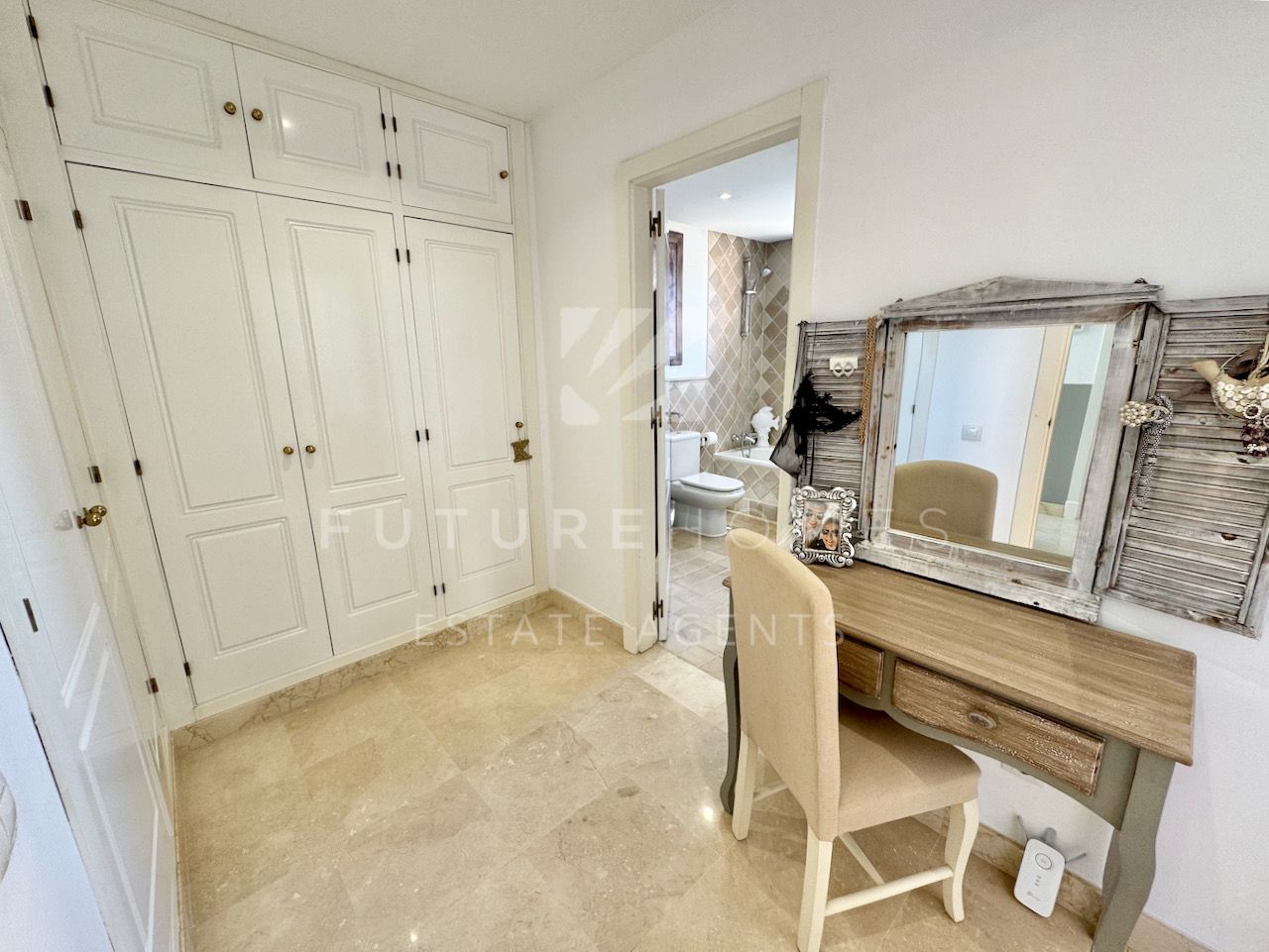 Superb semi detached townhouse for sale in one of the most demanded communities within Seghers, next to El Cristo beach and just less than a 10 minute walk from Estepona marina. Small residential urbanisation which is 100% occupied and lived in year round as permanent homes, these houses are in such demand that people knock on doors hoping owners will sell! This property is within the first phase of the community, one of just 8 semi detached houses and the only one with its very own private salt water swimming pool! As you enter, there is a very spacious reception area that leads onto a fully fitted modern kitchen with Siemens appliances and a lovely dining area within the kitchen itself, very practical indeed. On the same level there is a guest WC, storage cupboard and of course the large living / dining room with fireplace and large french doors opening onto the covered south facing terrace / garden area, ideal to enjoy the sunshine and a dip in the pool! On the first floor there are three double bedrooms, the master has a walk-in wardrobe and a very large bathroom with bath and separate shower, the balcony off the master bedroom has lovely open views. The two additional bedrooms share a family bathroom. The top level of the property has an amazing roof top terrace with incredible panoramic sea views and all day sun, an amazing space that is often converted into a fourth bedroom / home office. Private double carport with pergola roof. Two communal swimming pools. A fantastic property in an absolute prime location. Sure to sell quickly!!
